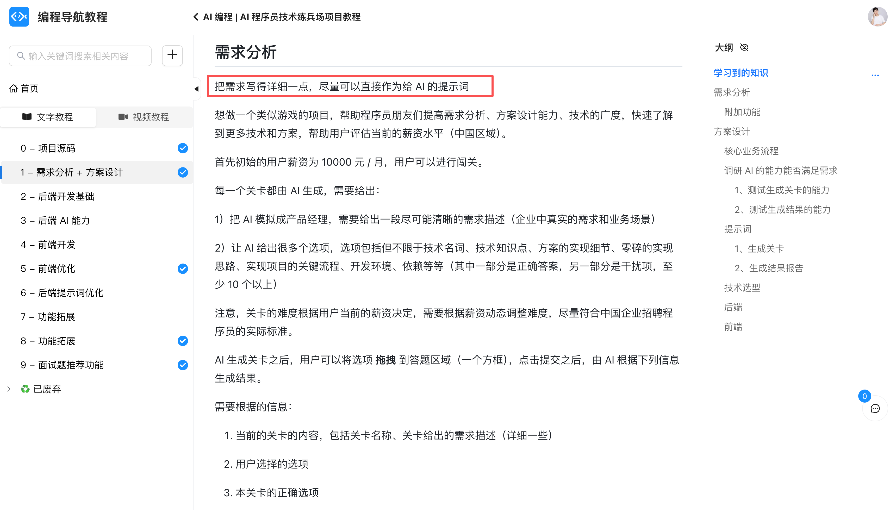 一般来说,整个项目的第一句提示词是最重要的,如果我要开发一个复杂的商业项目,肯定会好好打磨一下这句提示词,少说写个几百字(之前看过我 AI 程序员技术练兵场项目 的同学应该知道)。