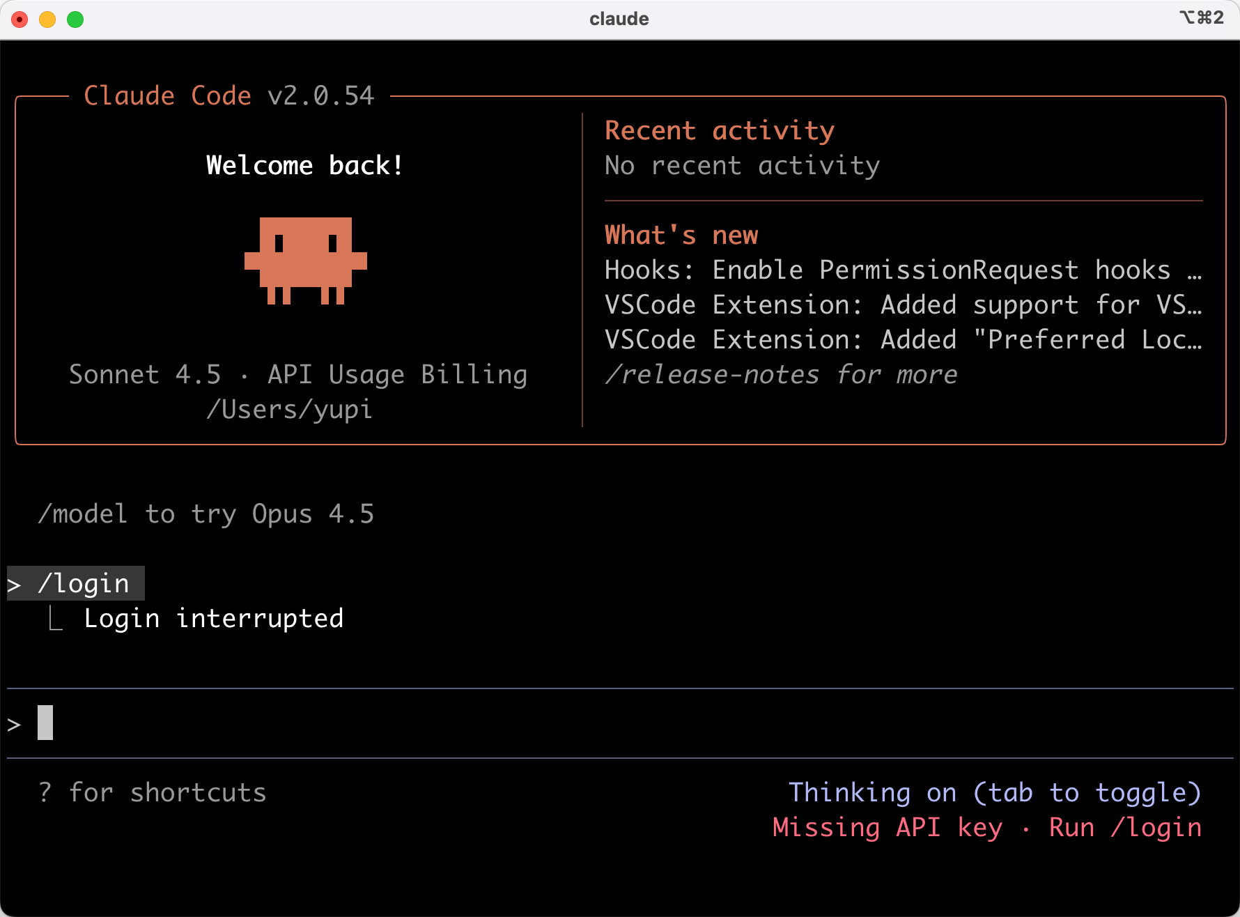 然后执行 claude 命令打开程序,默认是需要登录 Claude 账号的,否则无法使用: