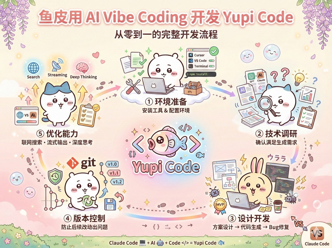 接下来,我们将遵循这套《鱼皮 AI Vibe Coding 开发仿 Claude Code 的 Yupi Code》流程,不写一行代码,一步一步把 “Claude Code” 做出来!