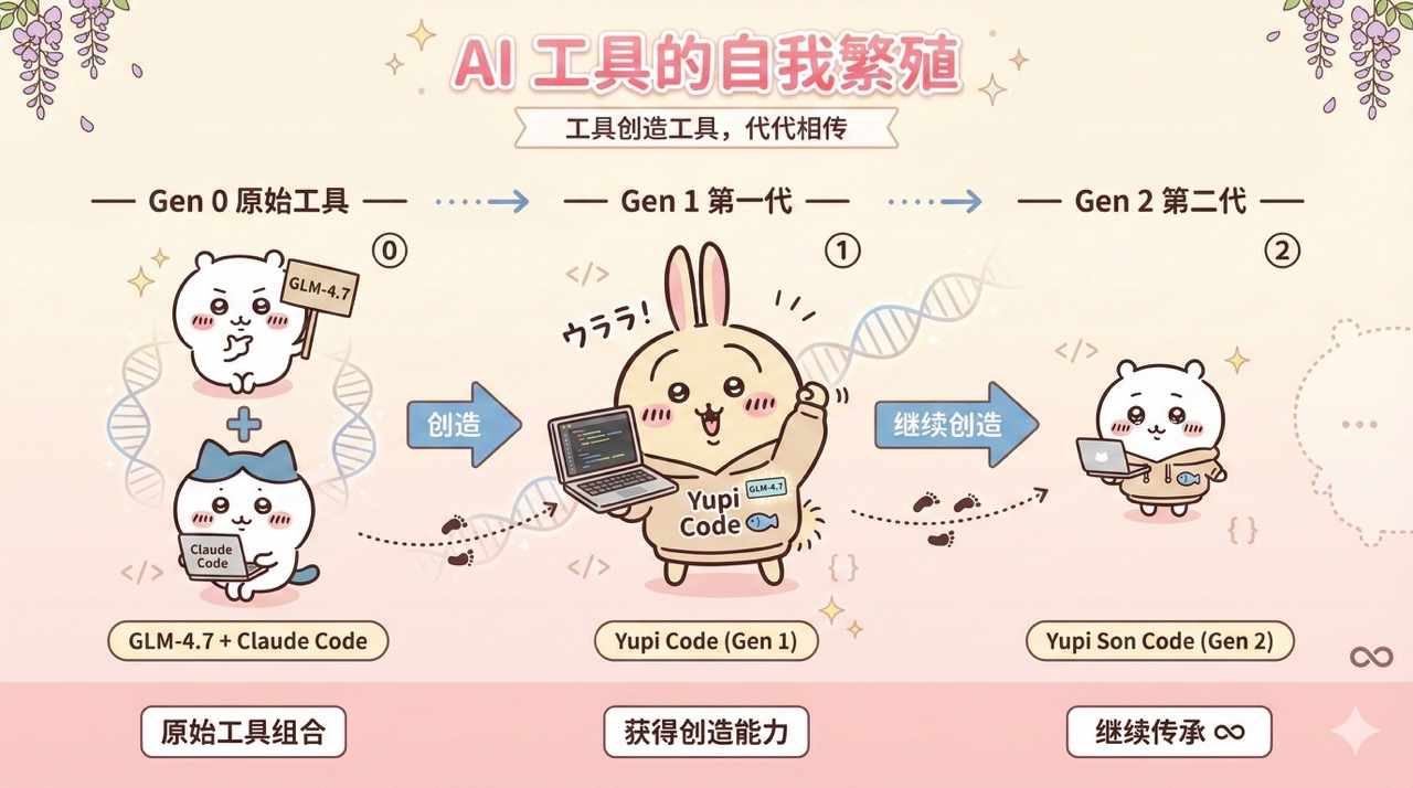 不过毕竟现在的 Yupi Code 是 AI 一把梭的,还有很多能优化完善的地方。如果后面有时间,大家也感兴趣的话,说不定我会好好打磨打磨这个工具把它开源出来。我的终极目标是,让基于 AI 大模型 GLM-4.7 + Claude Code 开发的基于 GLM-4.7 的 Yupi Code 编程工具,能够开发出一个基于 GLM-4.7 的 编程工具,比如 Yupi Son Code。我认为好的 AI 工具就是要能做到无限套娃,疯狂自举!