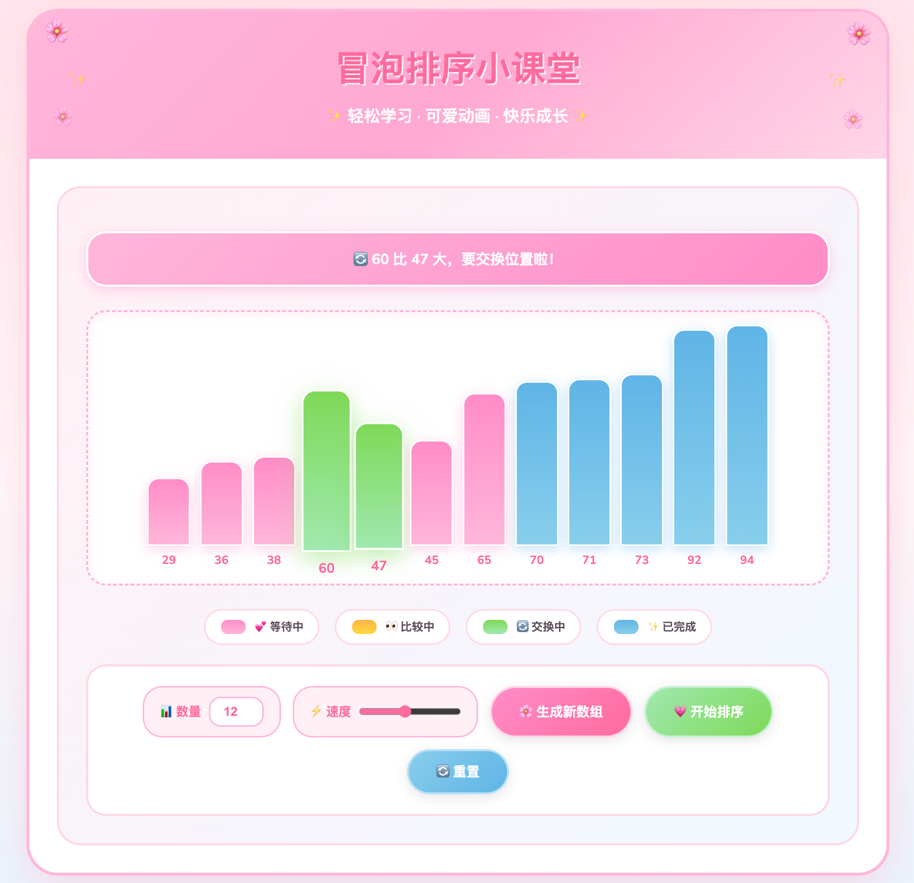 帮我开发一个学习冒泡排序算法的动画网站,使用 Q 版动漫的风格和吉伊卡哇感觉的配色