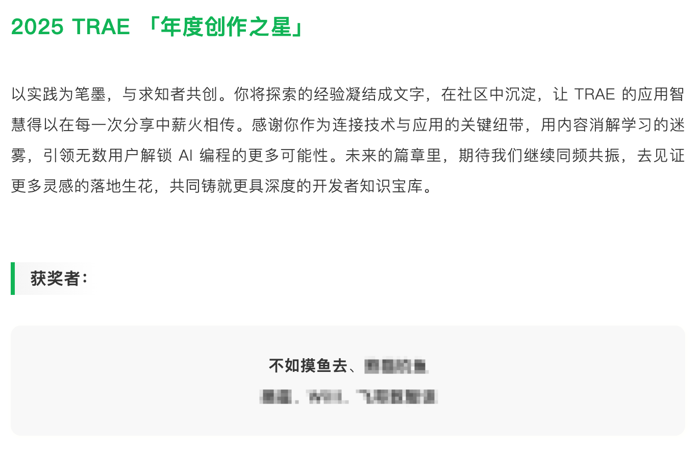 12 月 27 号,获得了 TRAE 2025 年度五大用户奖——年度创作之星,感谢 TRAE。