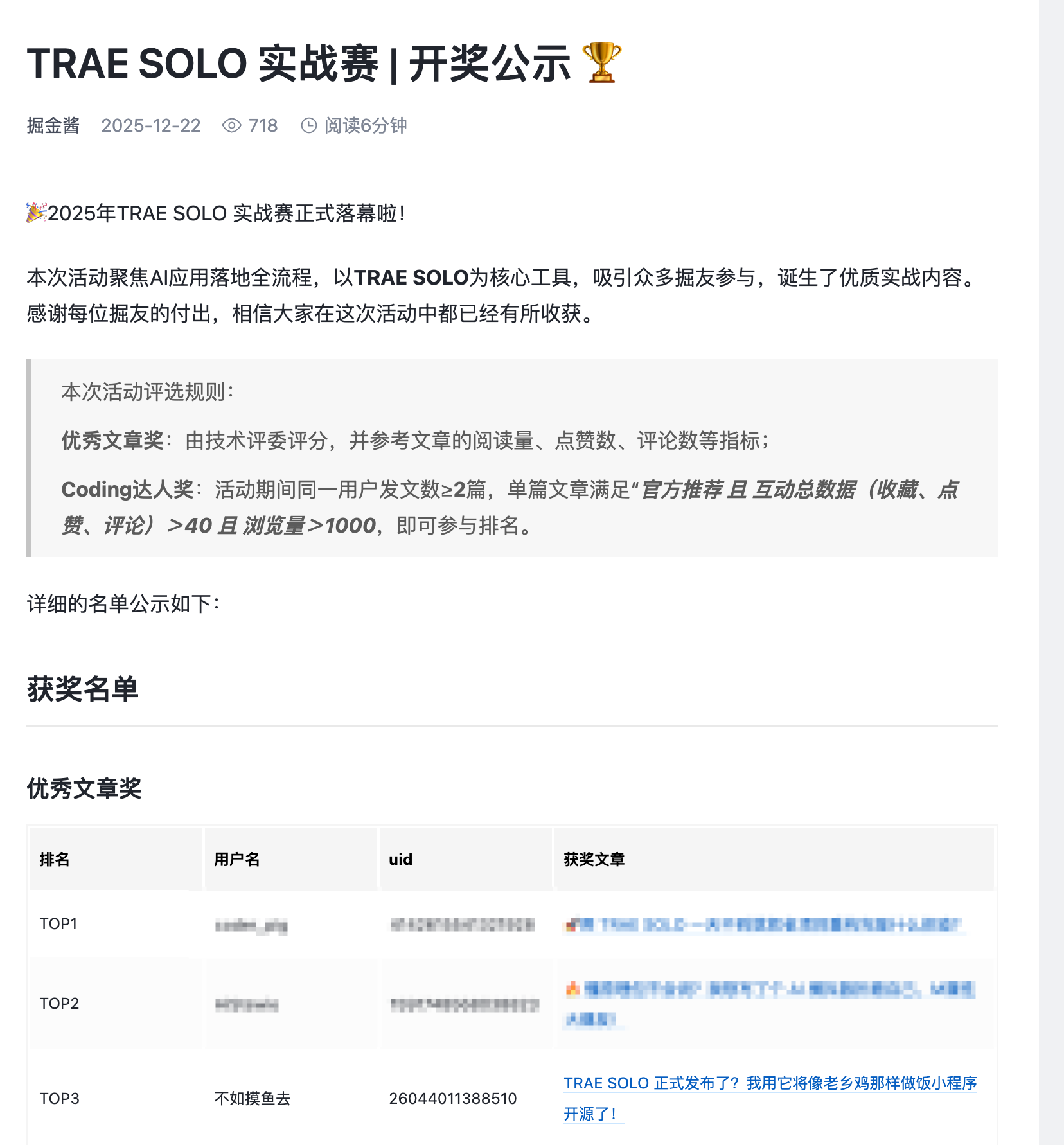 这篇文章则获得了 TRAE SOLO 实战赛的第三名。地址:https://juejin.cn/post/7586167377382801434。