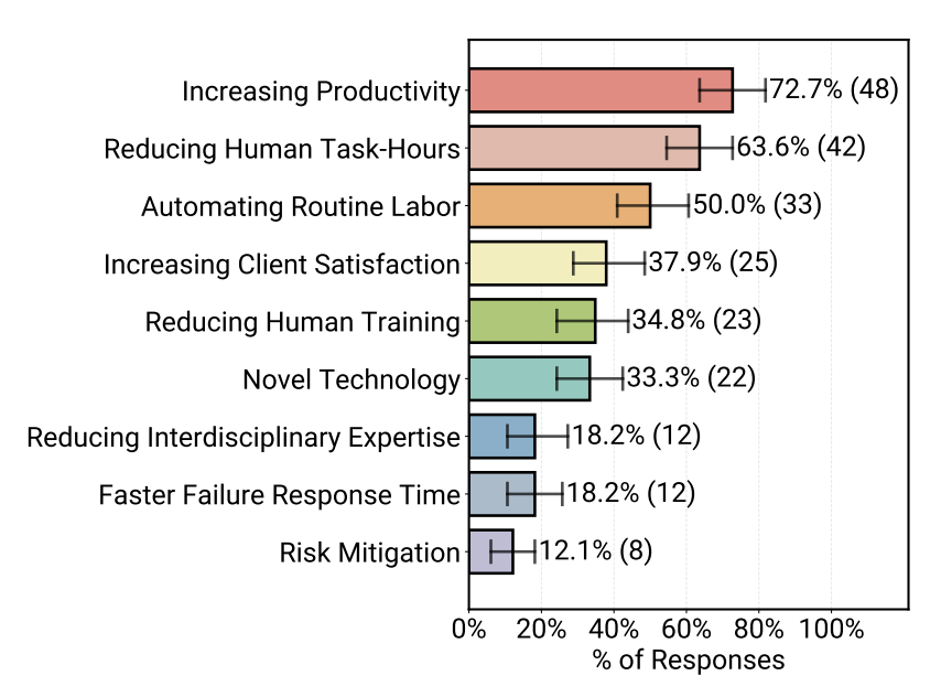 在为什么要做 Agent这件事上,企业高度务实:**提升效率/生产力(72.7%)、减少人力工时(63.6%)、自动化重复劳动(50%)**排在最前;而“风险缓释、加速故障恢复”这类更难量化/更慢反馈的价值排在后面。