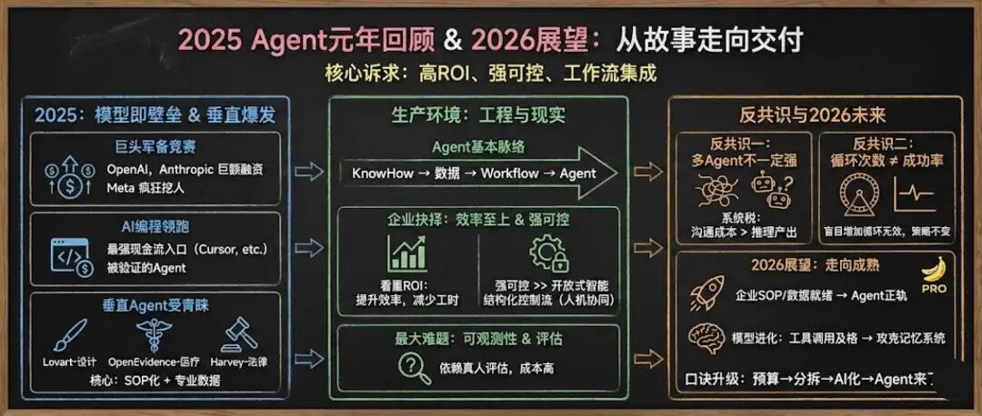 2025年成为Agent元年,AI编程如Cursor、GitHub Copilot等垂直Agent已验证商业价值。大模型开发者需关注KnowHow→数据→Workflow→Agent的发展脉络,多Agent系统并非更优选择,Token消耗与稳定性不成正比。2026年Agent将进入更成熟阶段,垂直领域应用和强约束Workflow将成为主流,开发者应把握可交付的垂直Agent机会。