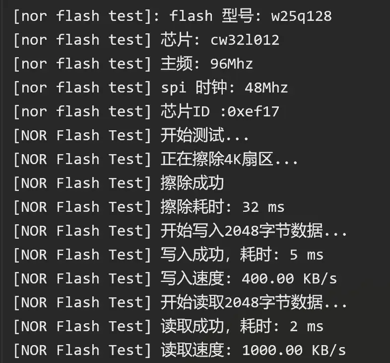 依旧选择cw32L012,该单片机有很多优点,高性价比,主频可达96M,SPI可运行在48M,高速的SPI对于flash的操作是非常吃香的,有更高的通讯带宽,对比103的18M SPI来说,提升太大了,我们测试读写w25q128速度如下: