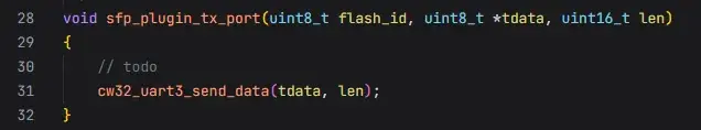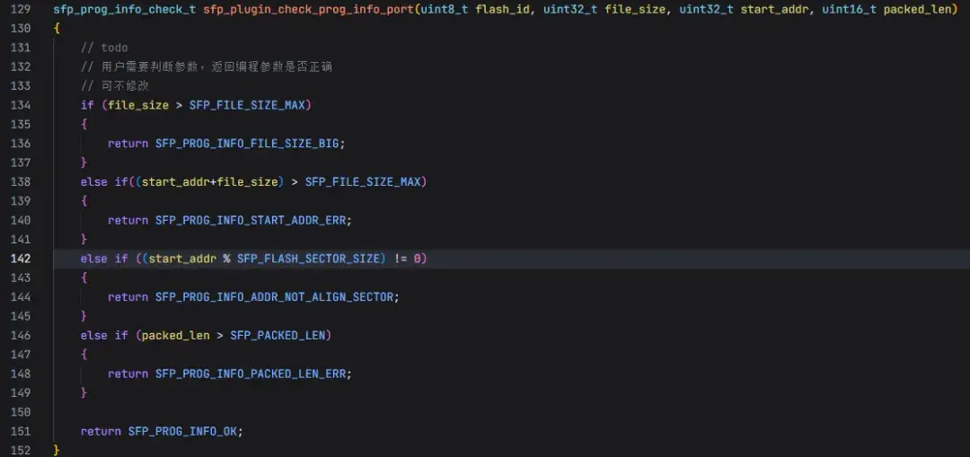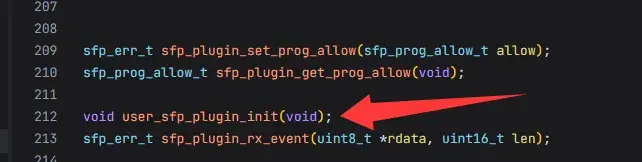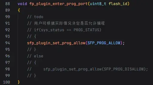 该函数用于提示用户现在已经请求进入编程状态,用户可根据实际情况去调用sfp_plugin_set_prog_allow(SFP_PROG_ALLOW);来允许,或者调用sfp_plugin_set_prog_allow(SFP_PROG_DISALLOW);来拒绝。(此处固定允许编程)