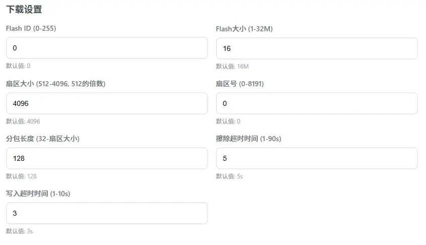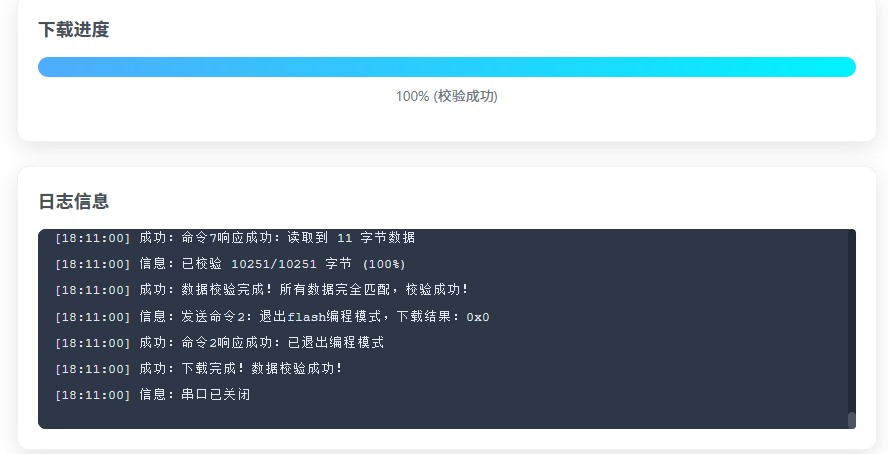 该工具是基于HTML语言开发,使用串口进行通讯,支持多种波特率,可配置下载的参数,如flash id号、flash 大小、下载扇区号、扇区大小、通讯分包长度 、擦除超时时间和写入超时时间等。参数均可修改,当修改的不合法时会自动调整到合法数值。文件的选择不关心文件类型,可以是任意类型,但文件大小要小于flash大小。另外设计有数据校验、差分更新、进度条和日志显示功能。