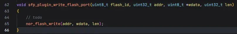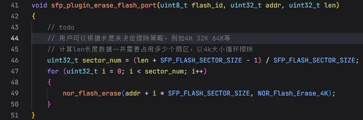 对接你实际的flash擦除函数接口。Addr为擦除的起始地址,len为擦除的总长度,你可以根据要擦除的大小自行决定擦除策略,如可以按最小扇区擦除,也可以判断如果len达到了32k或64k级别,去调用更大的扇区擦除函数,此处按最小扇区大小擦除。