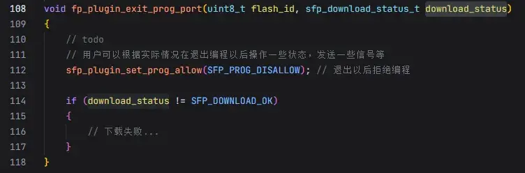 该接口用于提示用户已经退出编程模式了,download_status用户反馈本次的操作状态(操作成功、下载中断、校验失败),用户可判断其状态来做一些状态的指示,例如向GUI线程发送状态告知用户下载的结果。