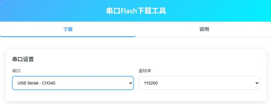 1.使用浏览器打开serial_flash_download_tool.html2.选择串口设置波特率