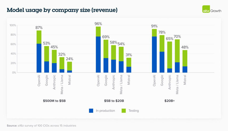 在早期使用者中,OpenAI的推理模型表现最为突出。尽管 DeepSeek 在行业中也有不少关注,但在生产部署方面,OpenAI 的优势非常明显:本次调研显示,有 23% 的企业已在生产中使用 OpenAI 的 o3 模型,而使用DeepSeek 的仅为 3%。不过,DeepSeek 在初创企业中的采用率相对更高,企业市场渗透仍较低。