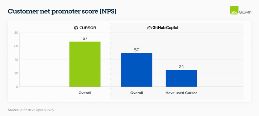 虽然传统厂商拥有渠道优势和品牌信任,但在产品质量与迭代速度上,AI 原生公司已开始超越。例如在编码工具领域,Cursor 这类专为 AI 场景构建的工具,让用户对传统的 GitHub Copilot 明显“不再满意”。