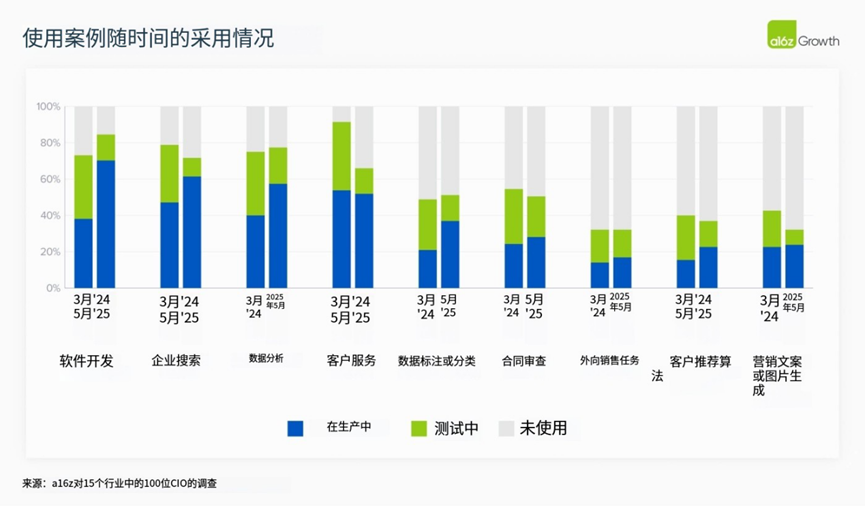 近日,A16z发布了一份主题为《AI技术在企业场景落地》的调研报告,报告基于与20多位企业买家的深度访谈和100位CIO的调研,全面回顾了企业在2025年如何部署、采购、集成和规划AI。