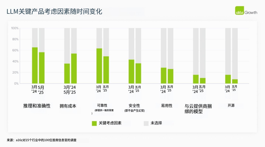 当前,企业在选择模型时已普遍采用系统性的评估框架。在我们访谈中,安全性和成本与准确性、可靠性一样,成为模型采购的核心考量。正如一位企业负责人所言:“现在大多数模型的基础能力都够用,价格反而成了更重要的因素。”