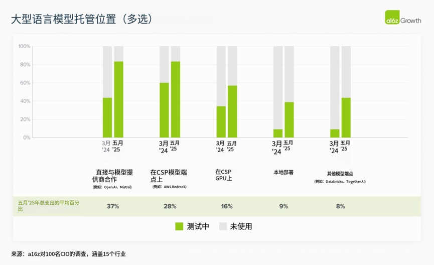 过去一年,企业与模型厂商之间的信任明显提升。虽然仍有一部分企业偏好通过现有云服务关系托管模型(如通过 AWS 使用 OpenAI),但越来越多的企业选择直接与模型提供方合作,或通过 Databricks 等平台托管,尤其是在模型并未由主力云厂商托管时。