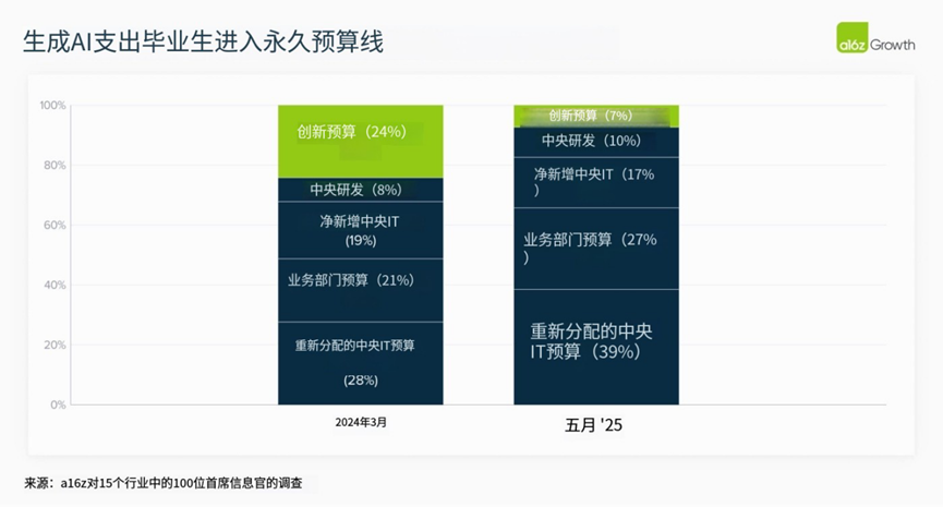一年前,企业在 LLM 上的支出中仍有约 25% 来自创新专项预算;如今,这一比例降至 7%。企业普遍将 AI 模型和应用的费用纳入常规 IT 与业务部门预算,体现出 AI 不再是探索性项目,而是业务运转的“基础设施”。