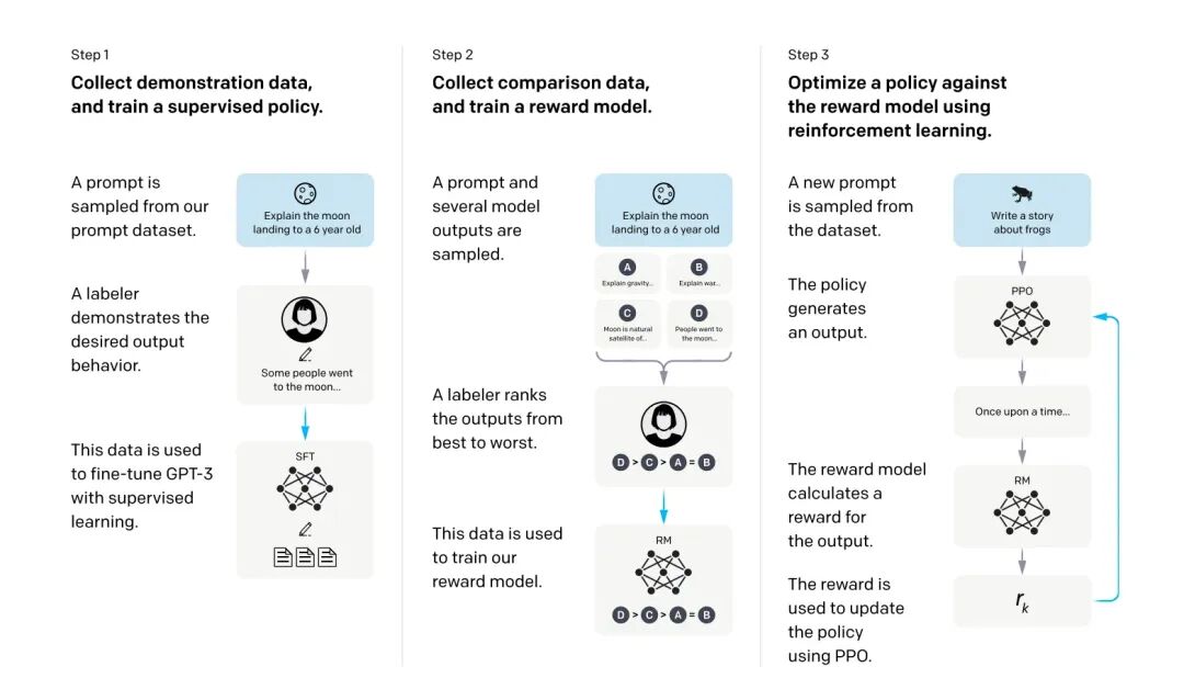 2.人类反馈:人类评审者与模型进行互动,对模型的回答进行评价,标注出哪些回答更好。Step2中的 A labeler ranks the outputs 的过程为标注员反馈的过程。