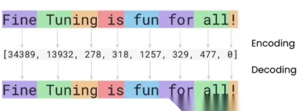 上面是文本进行 Tokenize 的过程,其中 Tuning 被拆成了两个小的token,这样就可以用有限的 token 来表示所有的单词。这也是有些时候大语言模型会“造词”的原因,错误的生成,Decode后的词可能是没有的单词。