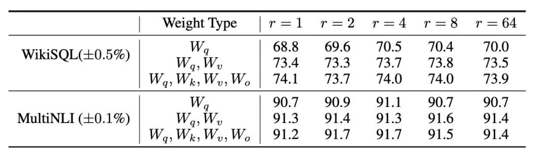 上面表格为在 WikiSQL 和 MultiNLI 上使用不同秩r的 LoRA 验证准确率。适配 Wq 和 Wv时,只有1的秩就足够了,而仅训练Wq则需要更大的r。Wq, Wk, Wv, Wo为 Transformer架构中自注意力模块中的权重矩阵。