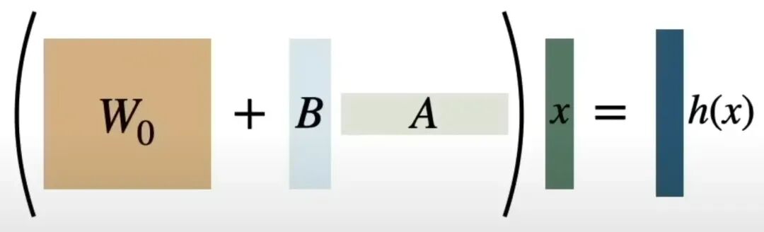 上图是矩阵分解后的示意图,可以直观的从矩阵的面积感知参数的多少,W0 为原始权重矩阵,如果需要进行全参数微调,W0 面积对应的参数都需要进行调整,而 LoRA 的方式只调整矩阵B、和矩阵A对应的参数面积的矩阵,比W0要少很多。