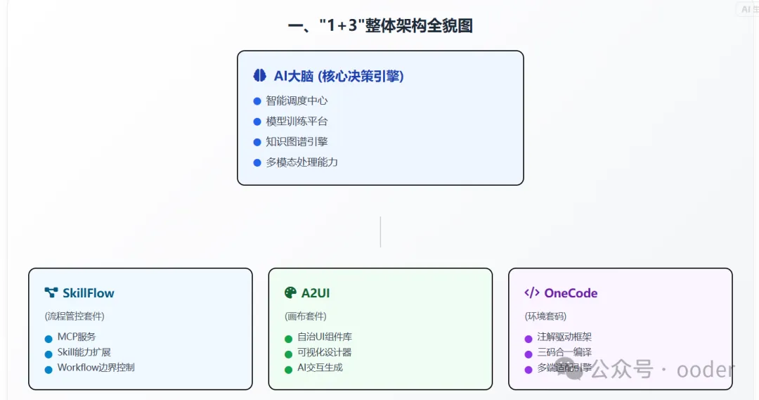 综上,2025年软件行业的寒冬与AI编程冲击,本质上是传统开发模式与新时代技术生态、价值需求的全面脱节,而A2UI、Skill技术与国内独特的“一拖三”闭环方案的协同,正从根本上颠覆软件行业的实施方案,推动行业走出困局。“一拖三”方案的三大核心套件(onecode、oodUI、SkillFlow),不仅让A2UI与Skill的技术价值充分释放,更构建起“需求输入-通用AI生成-SkillFlow驱动-多模块落地”的完整闭环,彻底打破了传统企业级软件“高成本、低效率、强依赖”的实施困境:二次开发更可控、系统扩展更简单、使用门槛更低,既缓解了AI编程带来的人才结构冲击,又让长期依赖“项目制”的中小软件企业得以摆脱个性化适配的沉重负担,转向“标准化产品+模块化套件”的盈利模式。对于整个软件行业而言,这种变革不仅提升了行业整体的研发与实施效能,更打破了传统垂直领域的技术壁垒,推动行业从“分散定制”向“统一标准+灵活适配”转型。可以预见,2026年,以“一拖三”闭环方案为核心的技术组合将成为行业主流,软件行业的实施逻辑将发生翻天覆地的变化,一个“通用AI驱动、套件支撑、闭环高效”的全新行业生态正在形成,标志着企业级软件正式迈入颠覆性发展的新时代。