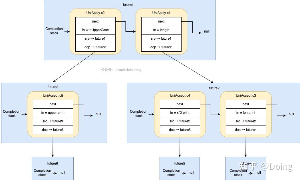 thenApplyAsync等方法时,会创建一个表示后续操作的Completion(如UniApply),若当前任务未完成,则将其压入自身的stack依赖栈中(注册) - 当任务通过