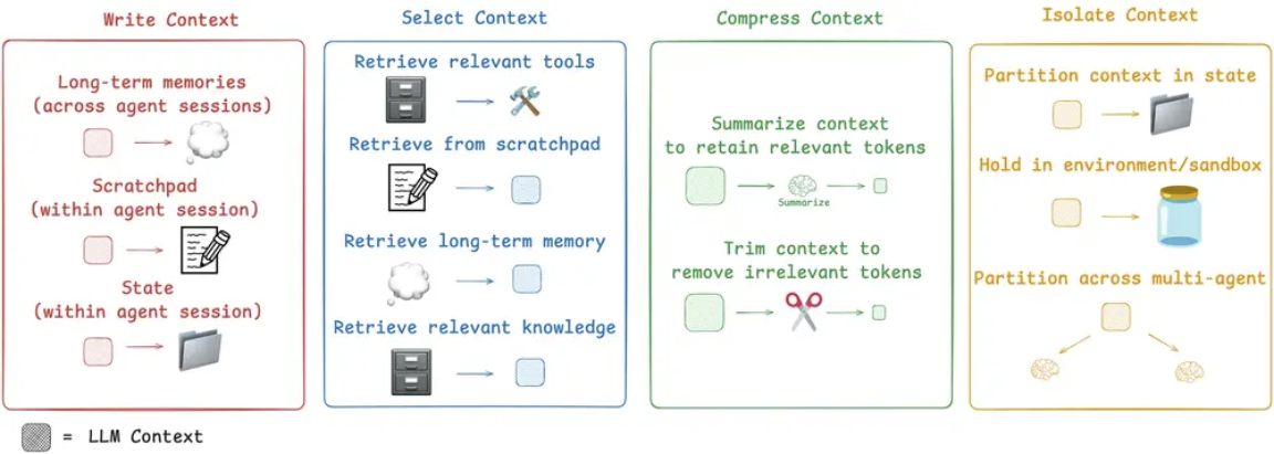 当今主流LLM代理中的上下文工程可以归结为四个基本步骤:Write、Select、Compress、Isolate。大多数“智能”产品(Claude、ChatGPT、Cursor、Windsurf 以及 OpenAI/Anthropic 风格的研究代理)其实就是在单一模型上下文窗口内对这四种作的不同编排。