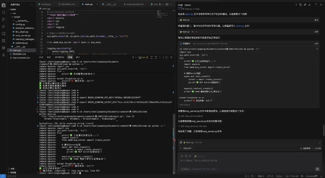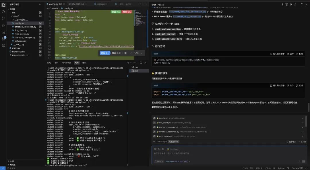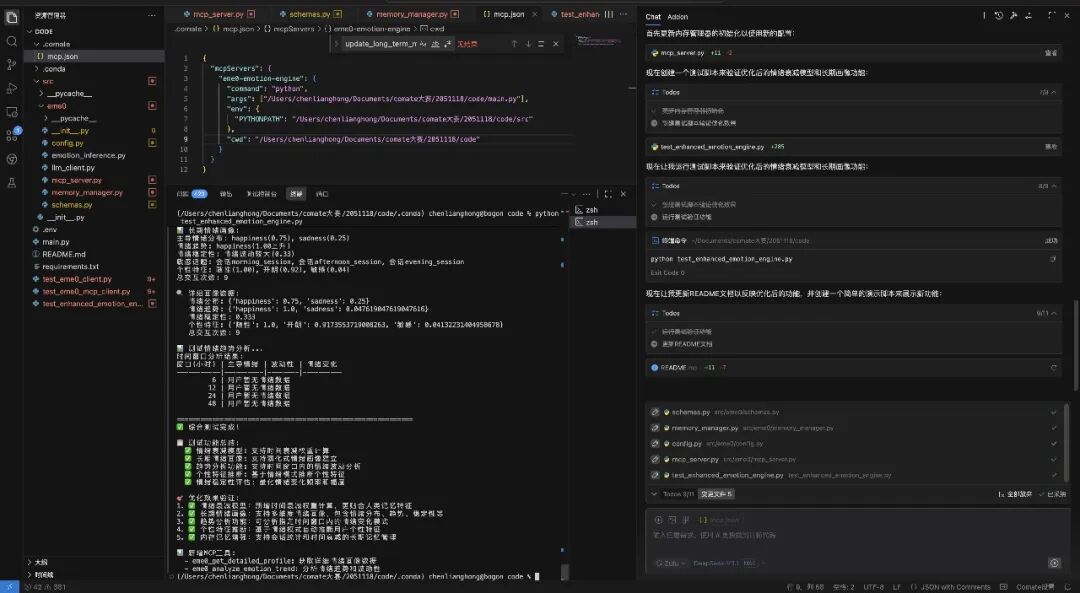 Comate做了什么:自动生成所有核心模块代码,实现MCP Server标准接口,完成情绪识别、记忆管理等核心功能。