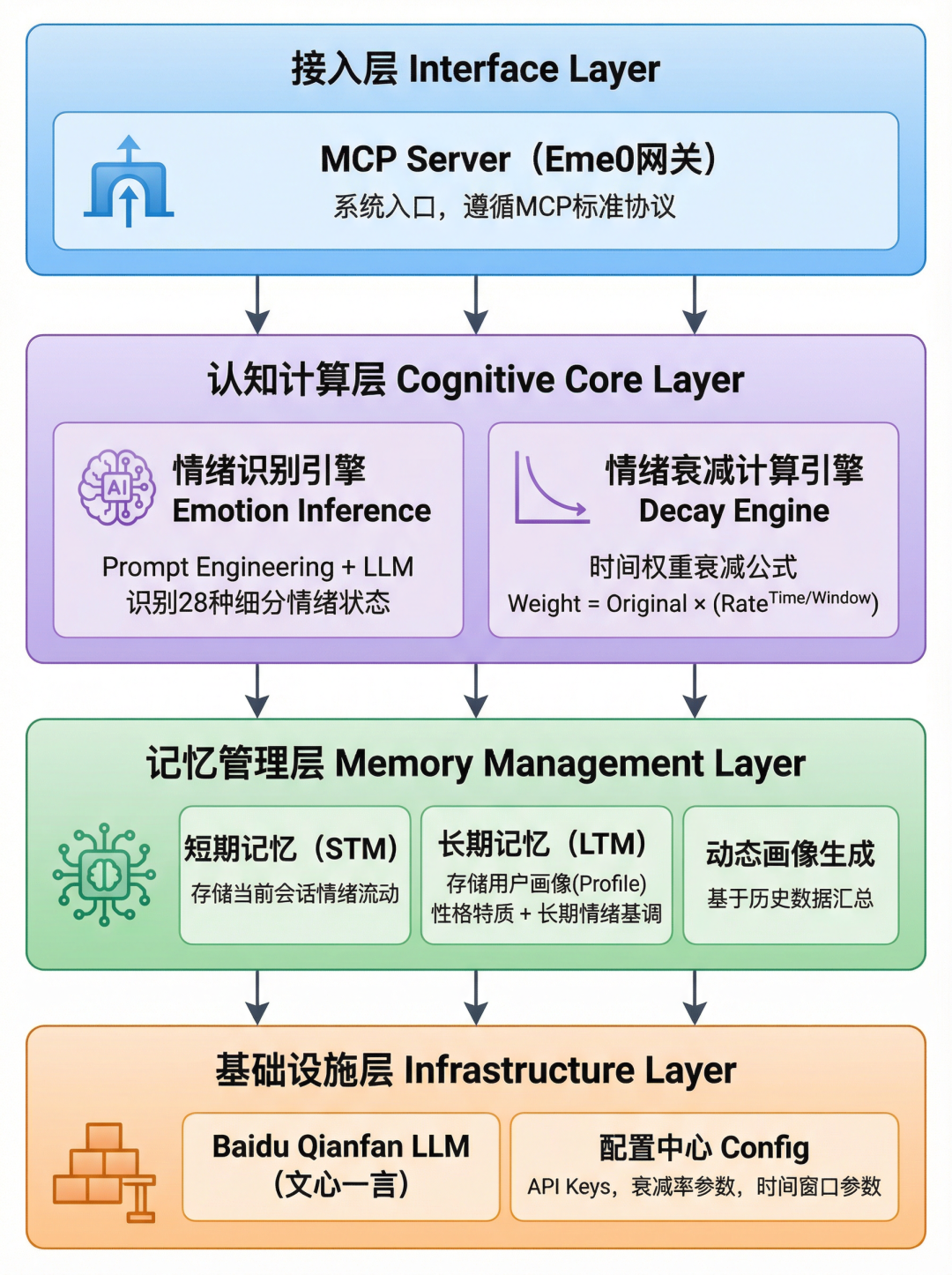 Eme0是一个Agent中间件,旨在为对话系统提供**情绪上下文支持**。它遵循标准的MCP Server架构实现,通过提供Tools接口,允许任何Agent实例进行即插即用配置,实现对话中的情绪感知、记忆和推理。