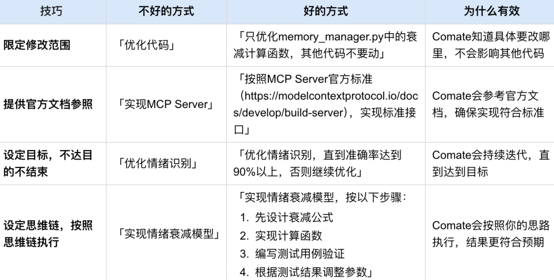 经过这次开发,我总结了一些使用Comate的Prompt经验,希望对大家有帮助: