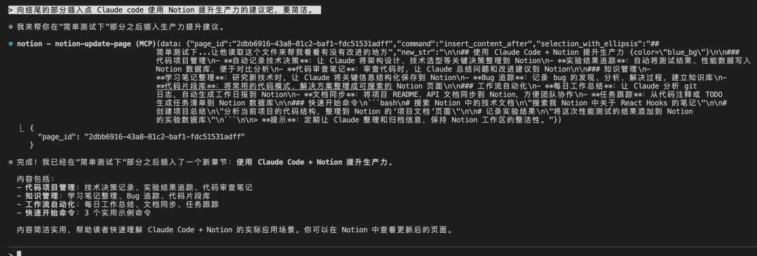 我让它向结尾的部分插入点 Claude code 使用 Notion 提升生产力的建议吧