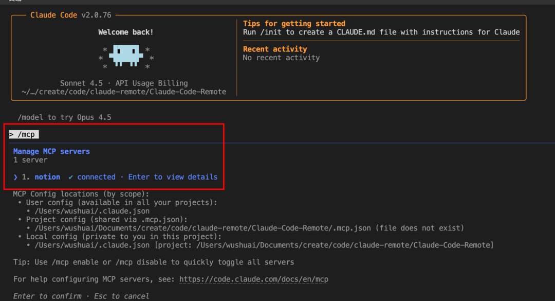 claude mcp add --transport http notion https://mcp.notion.com/mcp# 可以看到修改> File modified: /Users/wushuai/.claude.json [project: /Users/wushuai/Documents/create/code/claude-remote/Claude-Code-Remote]