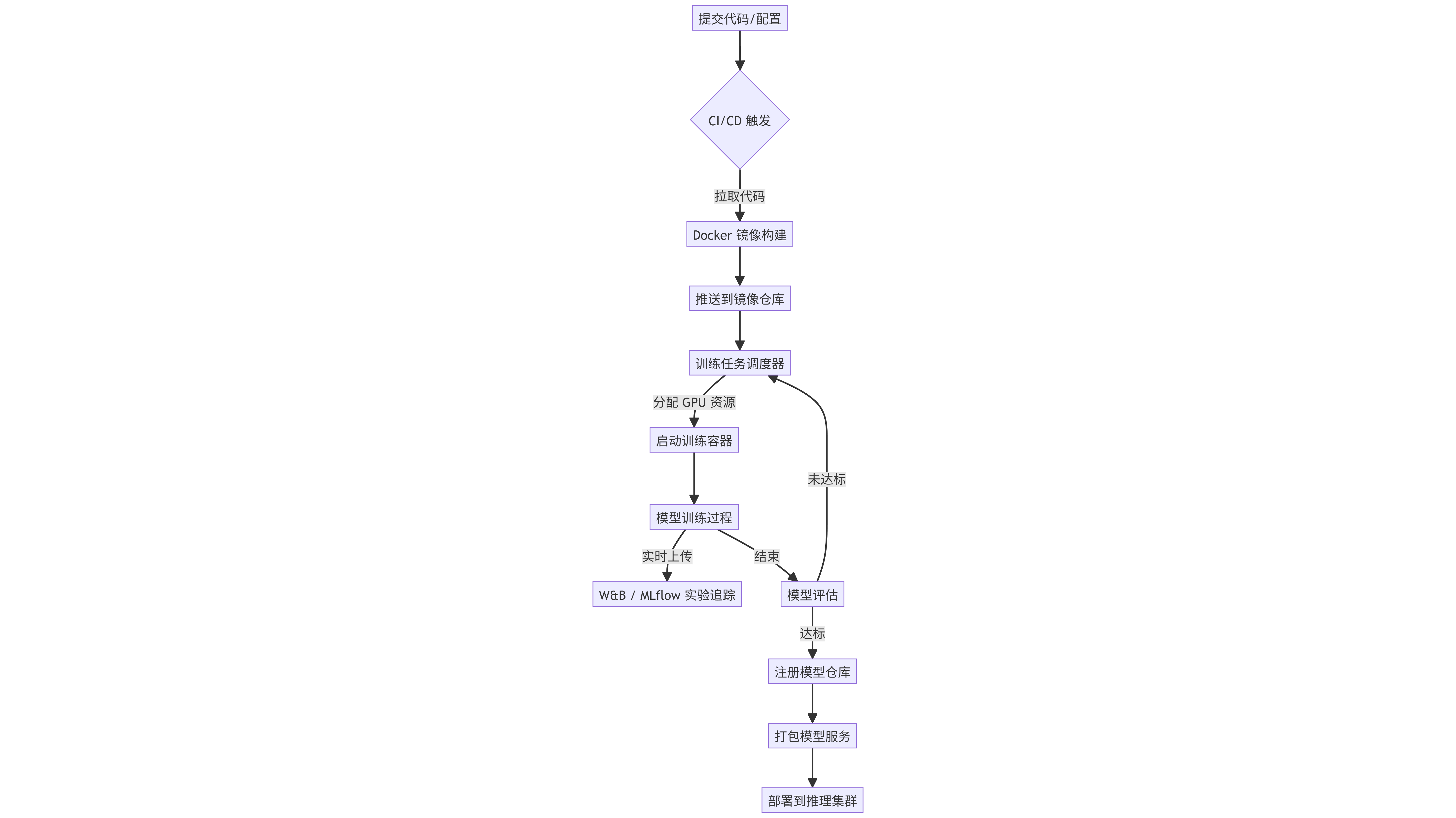 此图展示了从代码提交到模型上线的完整MLOps流水线。