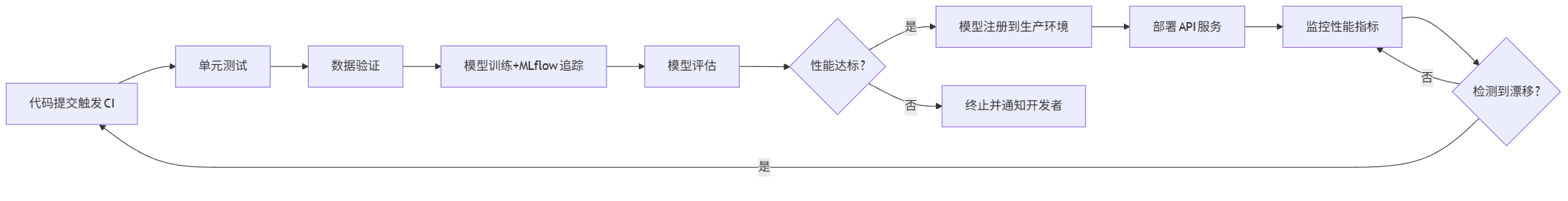 graph LR A[代码提交触发CI] --> B[单元测试] B --> C[数据验证] C --> D[模型训练+MLflow追踪] D --> E[模型评估] E --> F{性能达标?} F -->|是| G[模型注册到生产环境] F -->|否| H[终止并通知开发者] G --> I[部署API服务] I --> J[监控性能指标] J --> K{检测到漂移?} K -->|是| A K -->|否| J