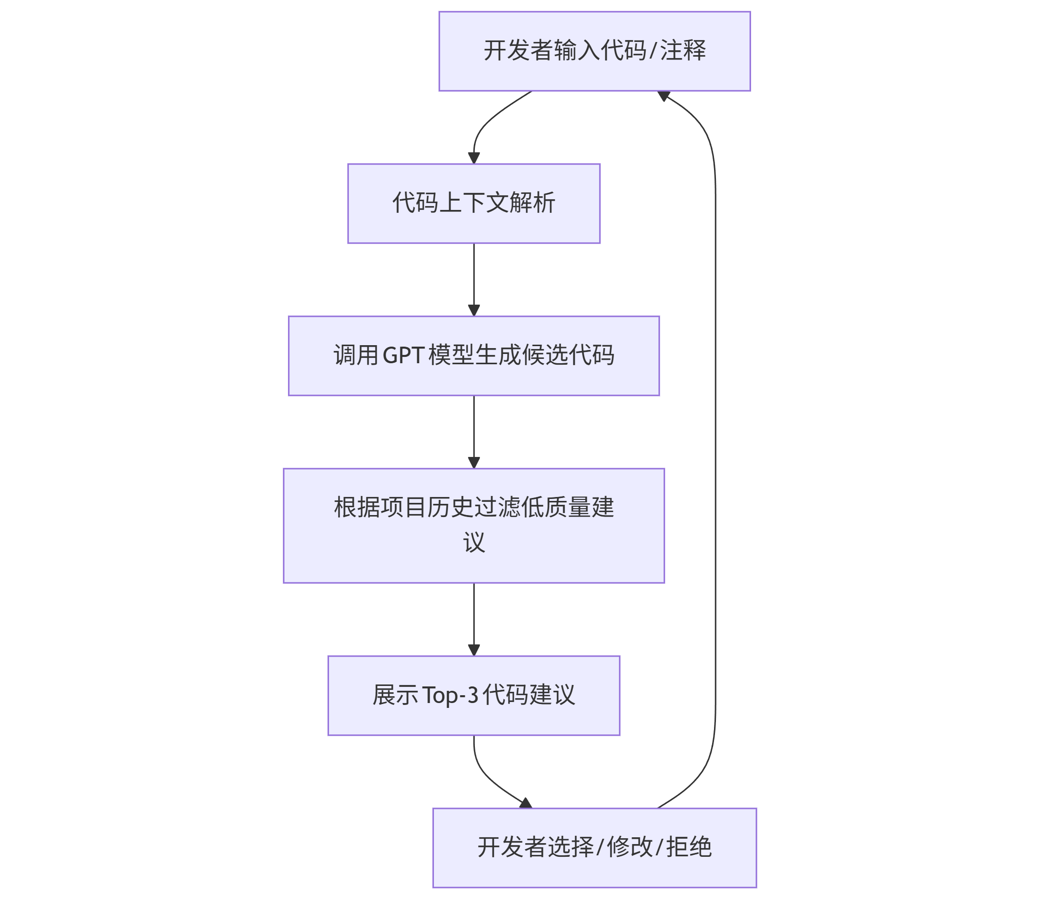 graph TD A[开发者输入代码/注释] --> B[代码上下文解析] B --> C[调用GPT模型生成候选代码] C --> D[根据项目历史过滤低质量建议] D --> E[展示Top-3代码建议] E --> F[开发者选择/修改/拒绝] F --> A