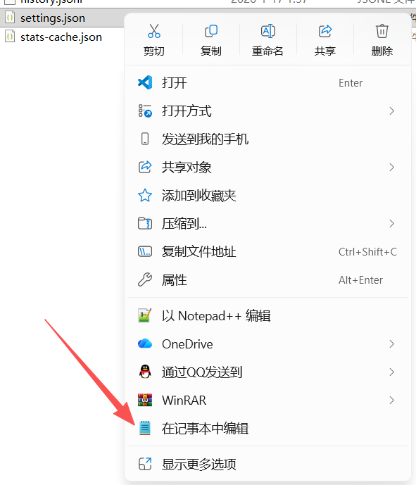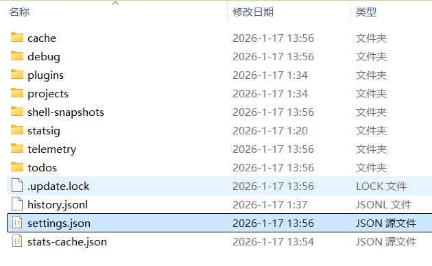 2.2 打开.claude,然后在里面看看你有没有 settings.json 这个文件,如果没有的话就自己创建一个。