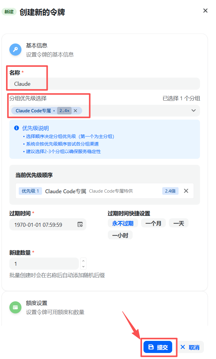 在这里,名称可以随便填写,分组优先级你可以选择“默认 default”或选择“Claude Code 专属”都是可以的!