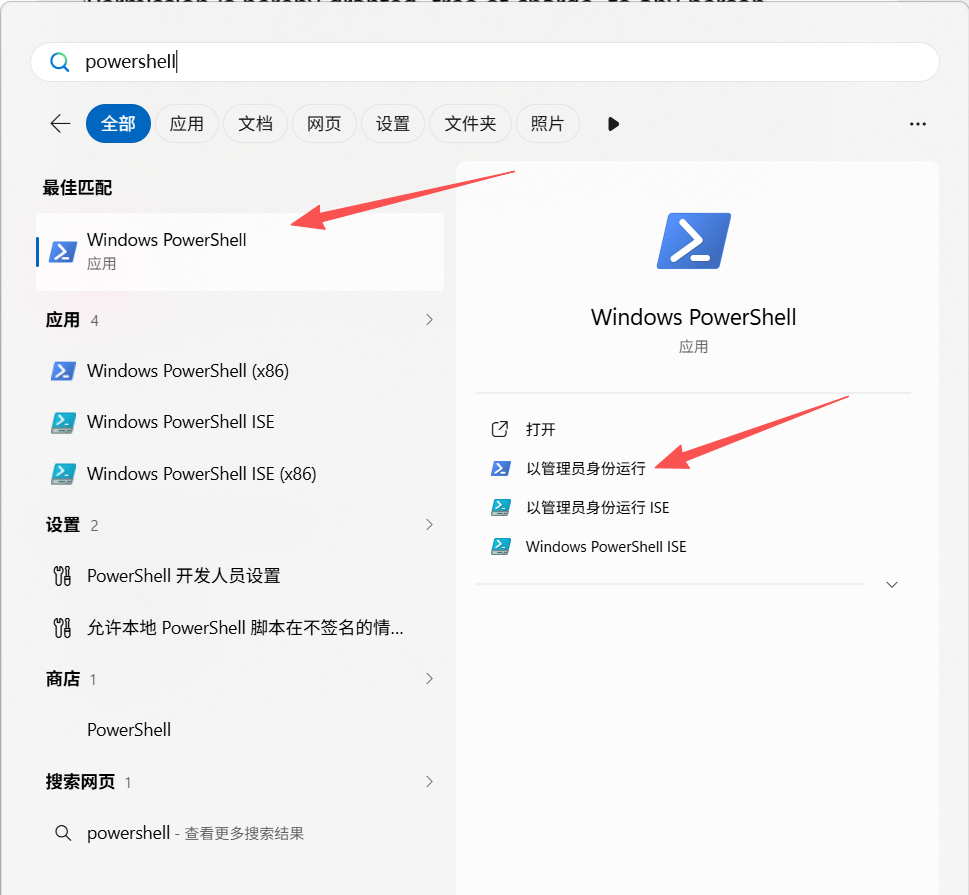 1.1 按下Windows键,在搜索框里输入:powershell,然后右键应用,点击以管理员身份运行。此时会打开黑色的命令行窗口。
