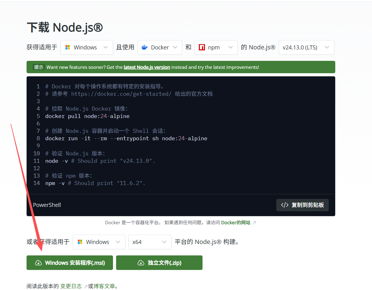 2.1 下一步,就是安装 node.js,同样也是点击链接即可。