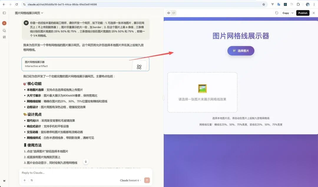 AI 生成的非文字内容,往往通过 Artifact 形式展示。例如使用 Claude 生成一个 HTML 网页,它在右侧直接展示了网页渲染效果,并且还支持发布上线。