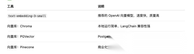 Vector store 向量存储技术选型:开发阶段用 Chroma,部署后切换为 Pinecone 或 Supabase 都有免费试用额度。