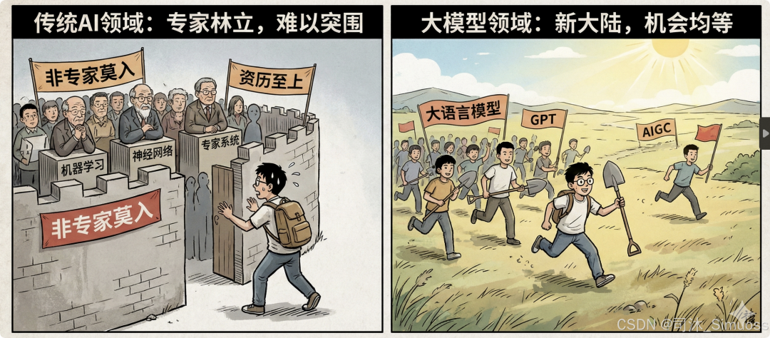 在大模型领域,大家都在摸着石头过河。你可能只需要花几个月的时间高强度学习,把最新的论文(从Arxiv)啃透,把最新的 Agent 框架跑通,你就已经是这个领域的前沿专家了。