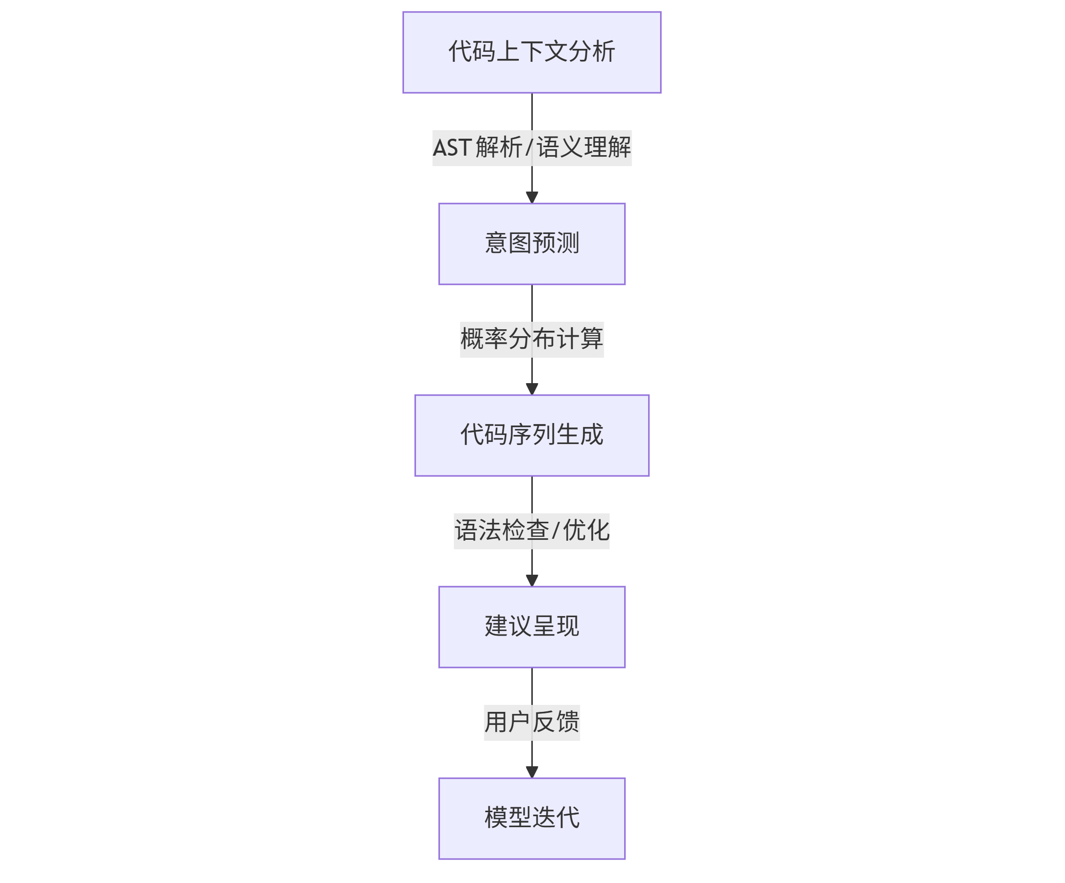 graph TD A[代码上下文分析] -->|AST解析/语义理解| B[意图预测] B -->|概率分布计算| C[代码序列生成] C -->|语法检查/优化| D[建议呈现] D -->|用户反馈| E[模型迭代]