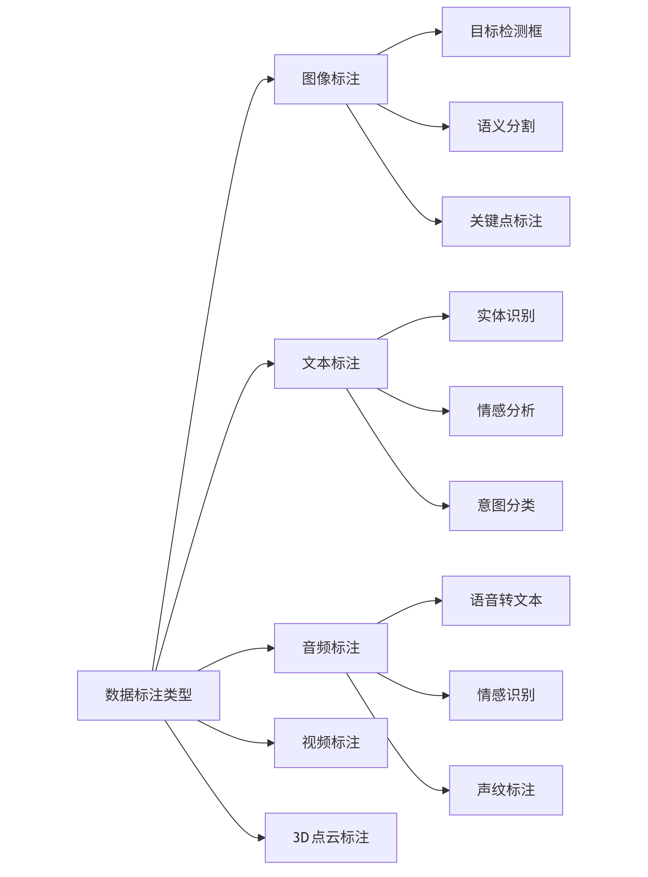 graph LR A[数据标注类型] --> B[图像标注] A --> C[文本标注] A --> D[音频标注] A --> E[视频标注] A --> F[3D点云标注] B --> B1[目标检测框] B --> B2[语义分割] B --> B3[关键点标注] C --> C1[实体识别] C --> C2[情感分析] C --> C3[意图分类] D --> D1[语音转文本] D --> D2[情感识别] D --> D3[声纹标注]