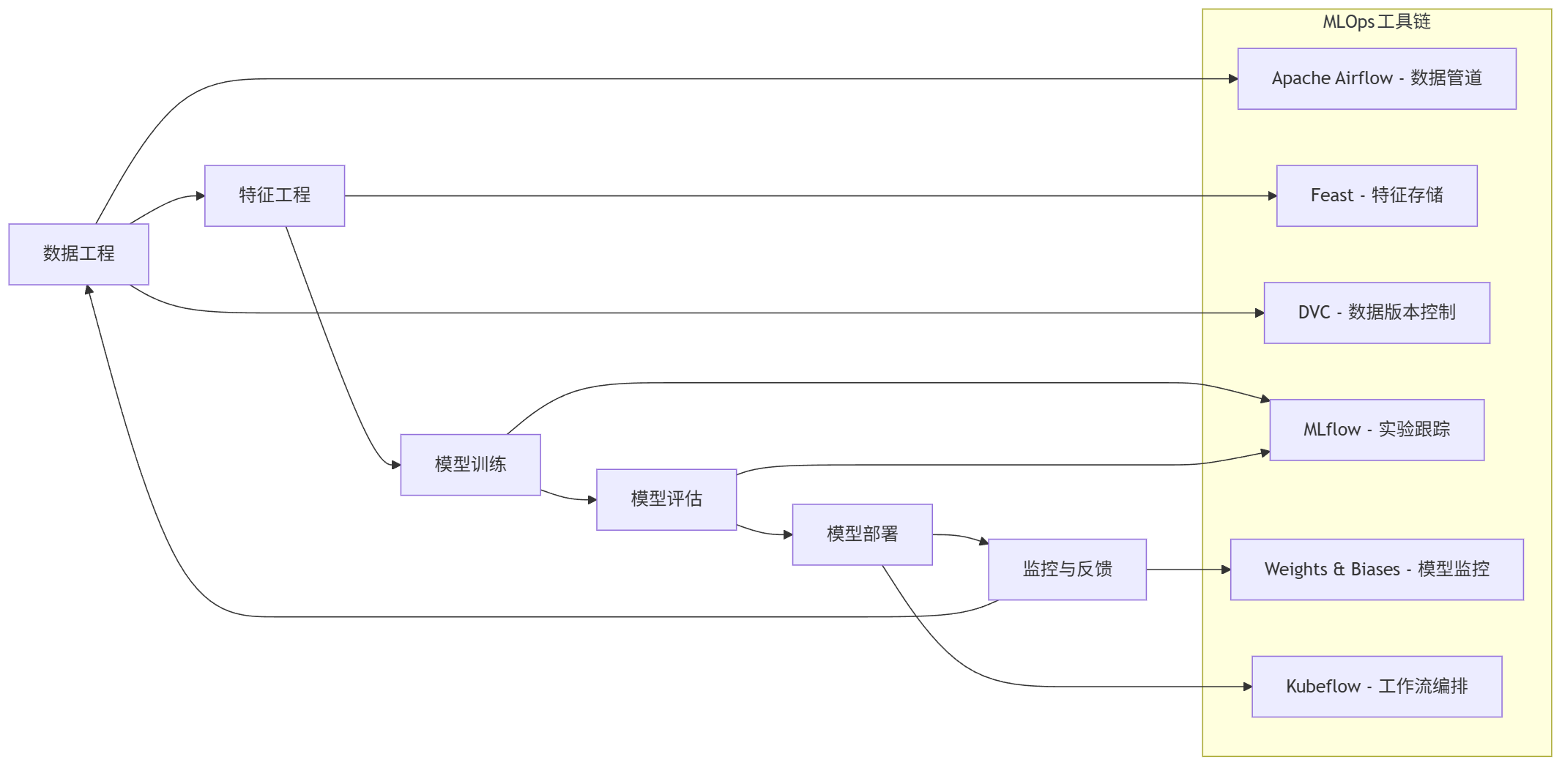 graph LR A[数据工程] --> B[特征工程] B --> C[模型训练] C --> D[模型评估] D --> E[模型部署] E --> F[监控与反馈] F --> A subgraph MLOps工具链 A1[Apache Airflow - 数据管道] A2[Feast - 特征存储] A3[DVC - 数据版本控制] B1[MLflow - 实验跟踪] B2[Weights & Biases - 模型监控] B3[Kubeflow - 工作流编排] end A --> A1 A --> A3 B --> A2 C --> B1 D --> B1 E --> B3 F --> B2