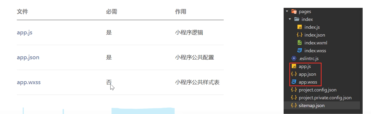 小程序包含一个描述整体程序的app和多个描述各自页面的page。一个小程序主体部分由三个文件组成,必须放在项目的根目录,如下: