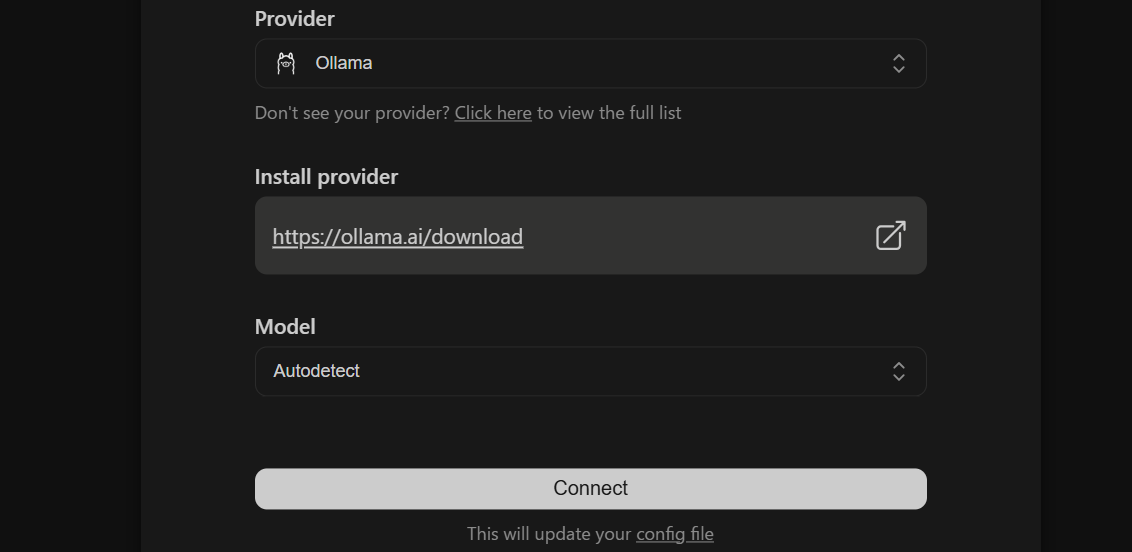 选择Ollama 然后点击Connect就可以了,会自动弹出config.yaml,然后将其内容补充完整。