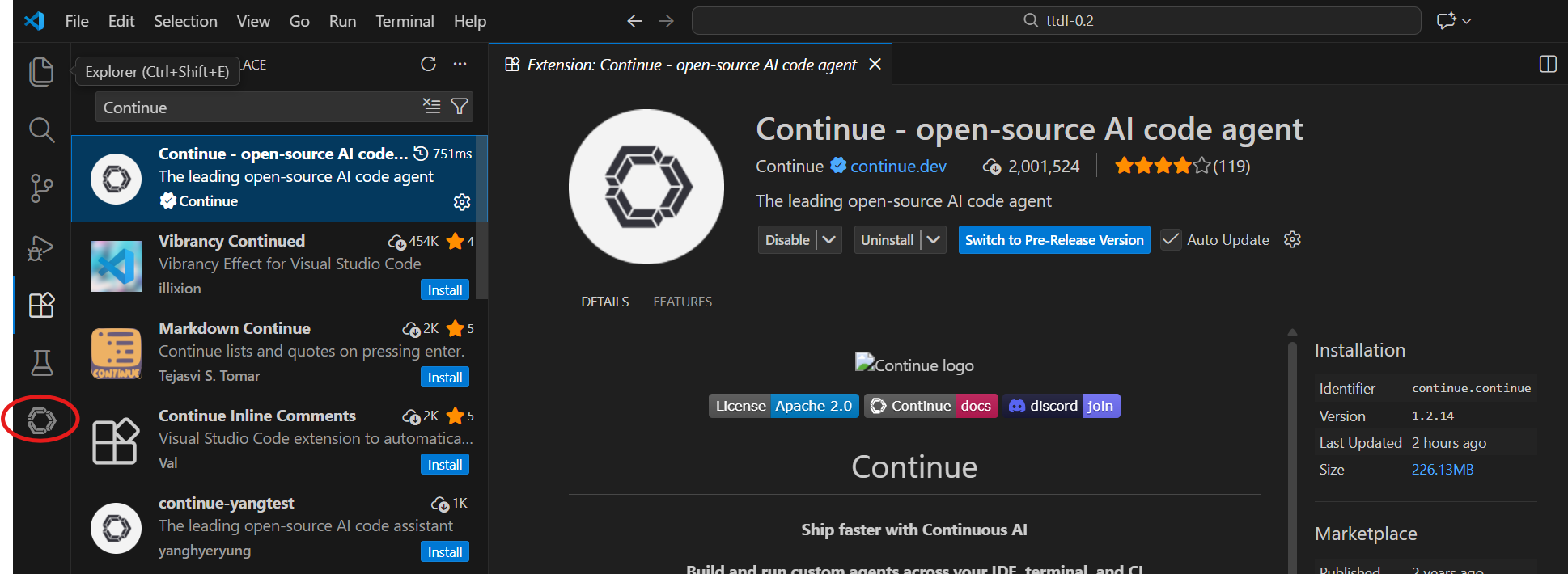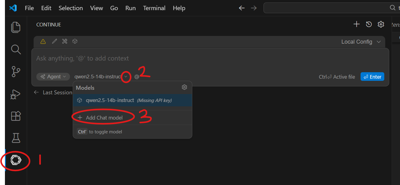 Continue安装完成后,VS Code 的边栏上会多一个图标。