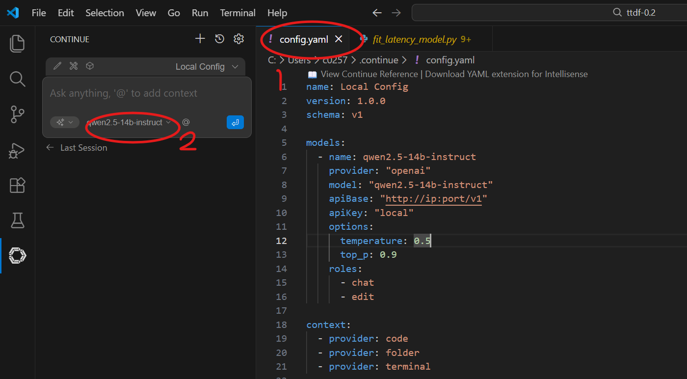 Qwen2.5-Coder-7B-Instruct(一个针对代码任务的7B参数模型)。provider: 设置为"openai",表示兼容OpenAI API格式(这里根据你的实际情况修改)。apiBase: 模型API的终端地址(http://ip:port/v1),指向一个本地或远程服务。apiKey: 你的模型API密钥。